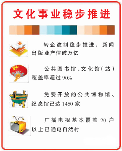 覆盖城乡的公共文化服务体系加快建立,人民群众的基本文化权益得到有效保障。“十一五”以来,公共文化服务体系建设已经进入快速、稳定的重要发展期。2009年,县级公共图书馆、文化馆、乡镇(街道)文化站覆盖率达到90%以上,基本实现了“乡乡有综合文化站”的目标;全国向社会免费开放的公共博物馆、纪念馆已达1450家,文化辐射力空前提高。