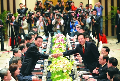 2009年4月26日上午,海峡两岸关系协会会长陈云林(右)与海峡交流基金会董事长江丙坤在南京举行会谈。这是两会恢复协商后领导人第三次会谈。新华社记者 孙 参摄