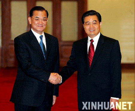 2005年4月29日,中共中央总书记胡锦涛在北京人民大会堂会见中国国民党主席连战率领的中国国民党大陆访问团全体成员。这是胡锦涛同连战亲切握手。 新华社记者王岩摄(资料图片)