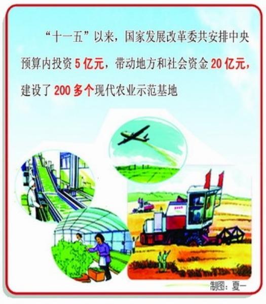 “十一五”以来,国家发展改革委共安排中央预算内投资5亿元,带动地方和社会资金20亿元,在各地建设了200多个现代农业示范基地。目前,现代农业示范项目已经成为各地展示现代农业的窗口、促进农民增收致富的渠道、农民就地就近转移的平台和农业产业化经营的典范,正在发挥重要的引导、示范和辐射带动作用。