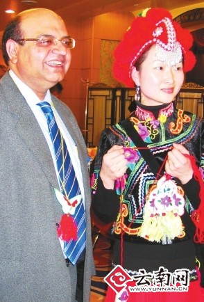 印度客人激动地接受了彝家小阿妹送上的荷包,他乐呵呵地说:“I Love Yunnan!”