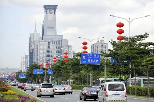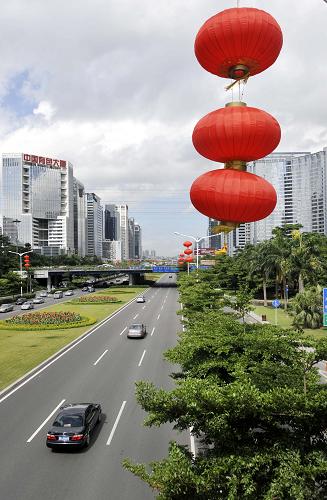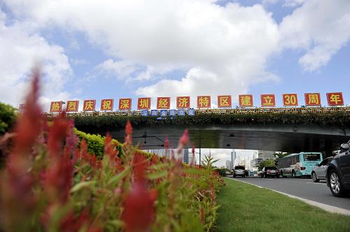 在深圳经济特区建立30周年之际,深圳市在深南大道、滨河大道等主干道上悬挂国旗、红灯笼,设立庆祝标语,迎接深圳经济特区30岁生日。