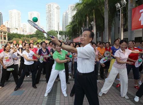 8月21日,温家宝来到深圳皇岗社区看望居民时,与居民们一同做柔力球运动。