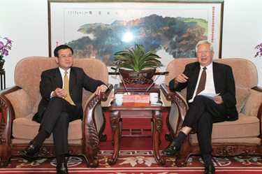 图1:全国政协副主席、中国和平统一促进会副会长罗豪才(右)亲切会见访问团成员。