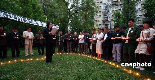 五月二十一日晚,旅居莫斯科的华人华侨、留学生自发汇聚在伊兹麦伊洛沃公园附近,悼念四川大地震遇难者。 中新社发 田冰 摄