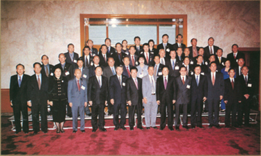 图片:中共中央政治局常委、全国政协主席李瑞环(前排左七),全国政协副主席、中央统战部部长王兆国(前排右六),全国政协副主席、中国和平统一促进会会长万国权(前排左五)等与访问团全体成员合影。