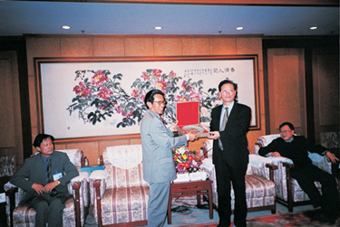图1:访问团一行在杭州受到浙江省政协领导的亲切接见,图为浙江省委副书记、省政协主席李金明“右二”向访问团团长夏康民“右三”赠送礼品。