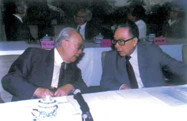 图1钱伟长会长(左)与全国政协副主席吴学谦在主席台亲切交谈。