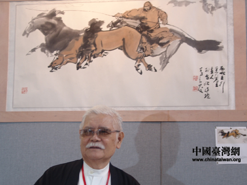 台湾著名绘画大师、83岁的李奇茂老人与他的参展作品“牧牛图”