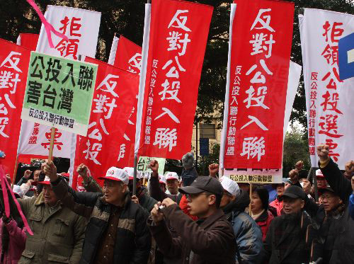 台湾民众在“中选会”前表达诉求,群众高举“反对公投入联,拒领公投票”等标语,主张拒领公投票。(图片来源:中国新闻网)