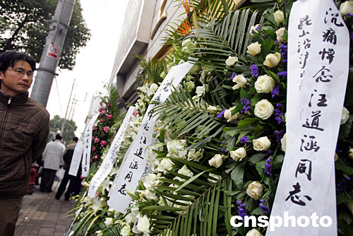 中新网上海12月30日电 (记者 许晓青)今天上午,海峡两岸关系协会会长汪道涵先生遗体送别仪式在上海龙华殡仪馆大厅举行。上海龙华殡仪馆大厅今天庄严肃穆,大厅门楣上悬有黑色横幅,上书:“为汪道涵先生送行”,两边的挽联上写着:申江水阔百年初现鸿图愿,海峡月圆万里同怀硕儒风。数百只洁白的花圈环绕于大厅内外,汪道涵先生遗体静卧于灵台上,白色和粉色的鲜花簇拥着他。