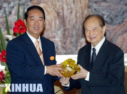 五月八日,正在上海访问的亲民党主席宋楚瑜拜会海峡两岸关系协会会长汪道涵,并向汪道涵赠送琉璃纪念品。新华社摄影