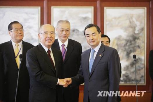 5月25日,中共中央台办主任王毅(前右)与中国国民党主席吴伯雄在北京首都机场握手。