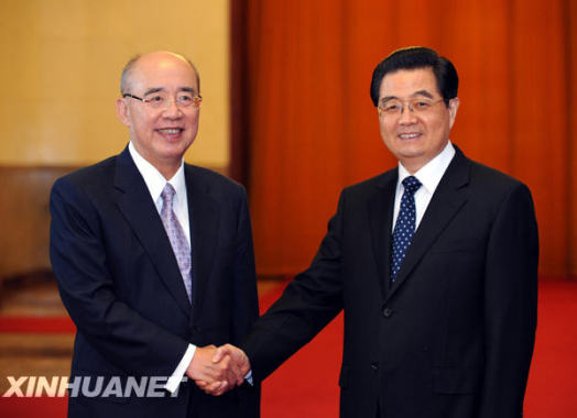 5月26日,中共中央总书记胡锦涛在北京人民大会堂会见中国国民党主席吴伯雄和他率领的国民党大陆访问团全体成员,并同吴伯雄举行会谈。这是胡锦涛同吴伯雄亲切握手。新华社记者 饶爱民 摄