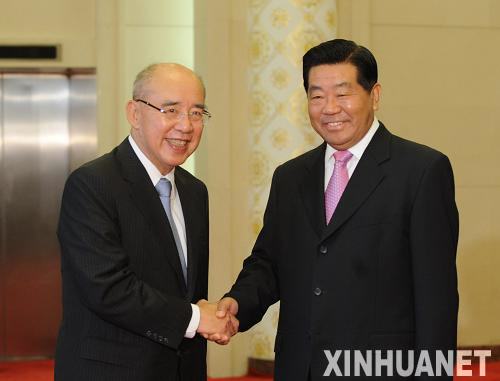 5月25日,中共中央政治局常委、全国政协主席贾庆林在北京人民大会堂会见中国国民党主席吴伯雄。新华社记者 李学仁 摄