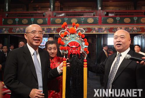 5月25日,中国国民党主席吴伯雄在北京湖广会馆接受湖广会馆馆长赠送的关公脸谱。当日,中国国民党主席吴伯雄率领中国国民党大陆访问团抵达北京,开始访问大陆行程。吴伯雄一行当天下午参观了北京湖广会馆。新华社记者 邢广利 摄