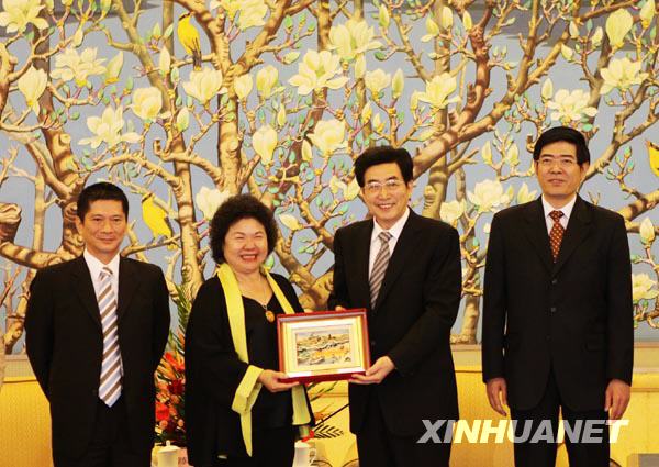 5月21日,陈菊向郭金龙赠送礼品。当日,北京市市长郭金龙在北京饭店会见高雄市市长陈菊及高雄世运观光行销团一行。新华社记者 邢广利 摄