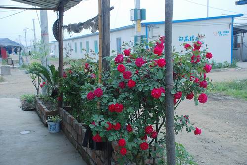 在居民黄大爷家,大妈在屋里做饭,大爷在门前前拾掇花草。一大簇月季开得正艳,旁边还放着几盆君子兰和一些我叫不出名来的花花草草。