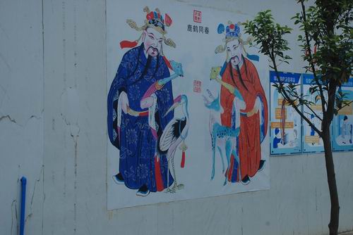 绵竹是我国的年画之乡,绵竹年画与天津杨柳青、江苏桃花坞、山东潍坊并称四大年画。贴年画、画年画是绵竹人民风俗。景观大道2号立交桥板房安置区,有板房约2万间,这里安置的都是绵竹市区房屋受损的居民,最多时达5万人,是汶川地震后最大的一个板房区。在这里,不仅能看到整齐的街道,旺长的花草,还有街道两旁墙壁上贴着的鲜活年画,年画或讲民间故事、或是历史传说,人物栩栩如生、身姿形态各异,个个饱含笑意,让人远远地就感受到一股暖春的气息……