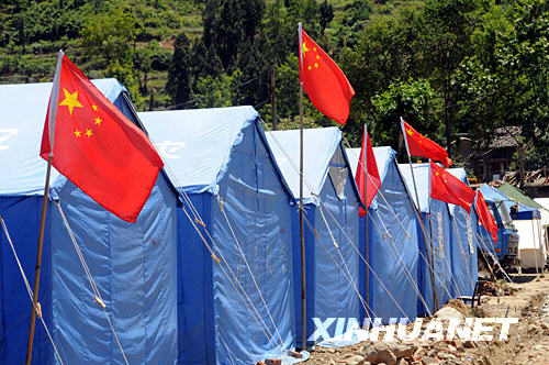青川是大地震中受灾最严重的地区之一。地震发生后,青川县专门购置了7500多面国旗,下发到每个安置点和每家每户。到处飘扬的五星红旗极大鼓舞了人们抗震救灾的士气。 新华社记者 杨金志 摄