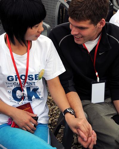 5月11日,在四川安县“真情大爱·回到灾区再看看”致谢活动现场,美国志愿者但以理和恋人、中国志愿者董明珠交谈。两人在去年地震灾区志愿服务活动中相识相爱。时值汶川大地震一周年之际,但以理特意从美国飞回四川安县,与在灾区坚持服务了近一年的董明珠相聚,并在灾区学校教孩子们学英语。新华社记者王茜摄