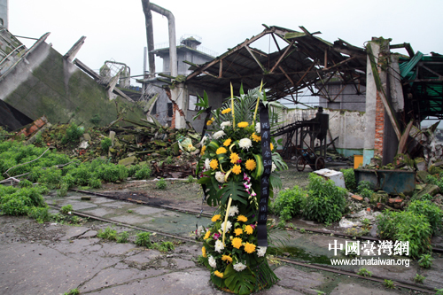 人们在厂区的入口摆上花篮凭吊地震中的罹难者。 (中国台湾网 田云鹏 摄)