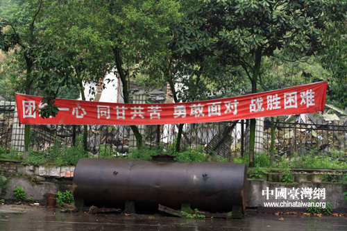 在废墟中一片比较开阔的地带,一条横幅宣示着厂区职工和家属抗震救灾的决心和信心。(中国台湾网 田云鹏 摄)
