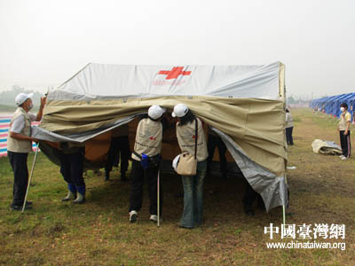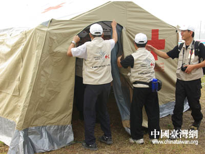 20日下午,台湾红十字组织医疗队带约3吨医疗用品等物资前往广汉市,21日在高坪镇,23日在体育场救灾点设立医疗救护站,展开救护服务。救护站设有中、西医。从21日至24日共计诊治476名。对数十名老弱灾民进行体检,做了一台气胸手术、两个骨折手术。和一个头皮缝合小手术。内、外科,儿科,针灸,急处方发药点。巴蜀音像制作中心 兰志泉 摄
