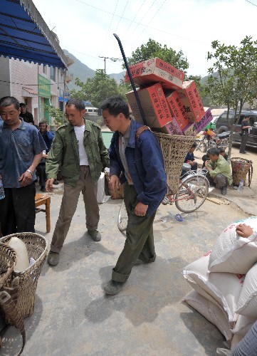 6月2日,北川县曲山镇杨柳坪村村民母贤清(左)领到了方便食品。目前,四川省抗震救灾指挥部物资组对所有救灾物资的运送、接收、分配、发放努力做到“三个一定”:一定要有账,物资来源、数量、分配方向要登记造册,做到有账可查;一定要及时分配,不能积压;一定要全程跟踪,防止物资去向不明,保证全部用于受灾群众。新华社记者 宋振平 摄
