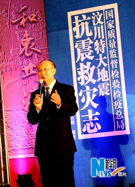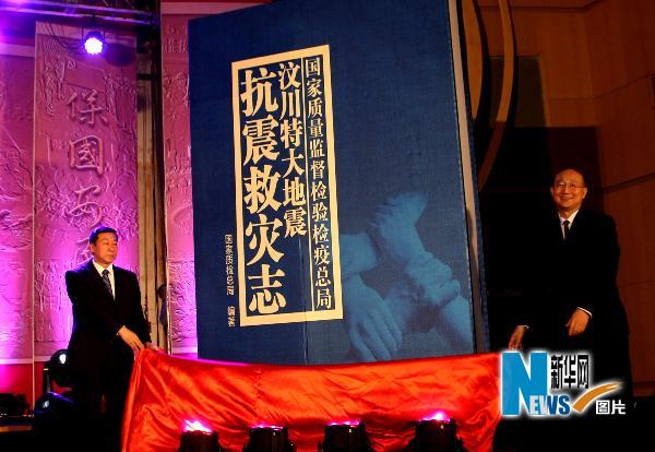 国家质检总局局长王勇(左)等为汶川特大地震抗震救灾志出版揭幕。新华社记者汪永基摄