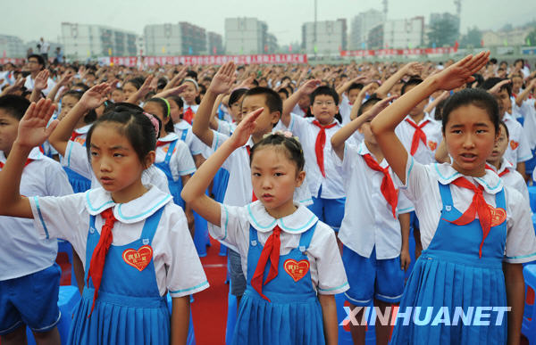 当日,都江堰市灾后重建竣工投入使用的48所中小学校交接仪式暨2009年秋季开学典礼在都江堰市北街小学新校区举行。全市7万余名中小学生全部告别了板房学校,搬进了灾后重建的永久性校园学习。 新华社记者 江宏景 摄