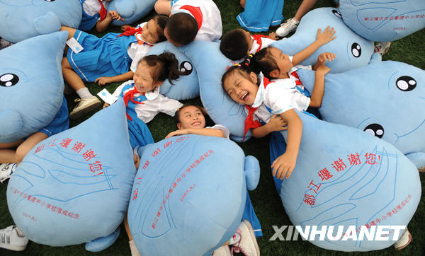 9月1日,在都江堰市北街小学新校区,小学生们手抱校方制作的代表感激的“水滴娃娃”。 新华社记者 江宏景 摄