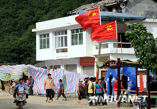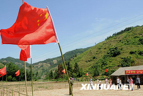 青川是大地震中受灾最严重的地区之一。地震发生后,青川县专门购置了7500多面国旗,下发到每个安置点和每家每户。到处飘扬的五星红旗极大鼓舞了人们抗震救灾的士气。 新华社记者 杨金志 摄
