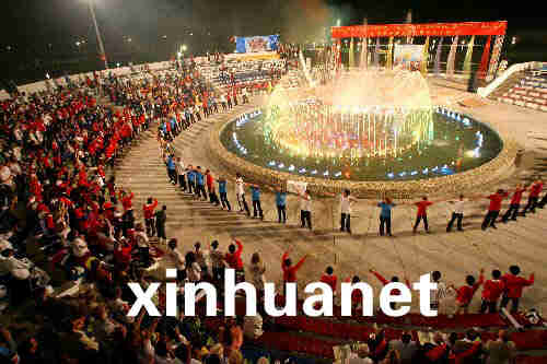 8月4日,在俄罗斯“海洋”全俄儿童中心,来自中国四川地震灾区的孩子们和俄罗斯辅导员共同参加告别晚会。新华社记者郑悦摄