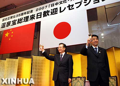 新华网东京4月12日电(记者 钱铮 钟沈军) 中国国务院总理温家宝和日本首相安倍晋三12日共同出席了由日本日中友好团体举办的纪念中日邦交正常化35周年招待会。
