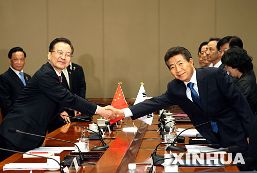 4月10日,中国国务院总理温家宝在首尔与韩国总统卢武铉举行会谈。新华社记者 饶爱民 摄