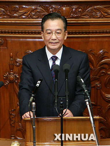 4月12日,正在日本进行正式访问的中国国务院总理温家宝在日本国会众议院发表演讲。新华社记者樊如钧摄