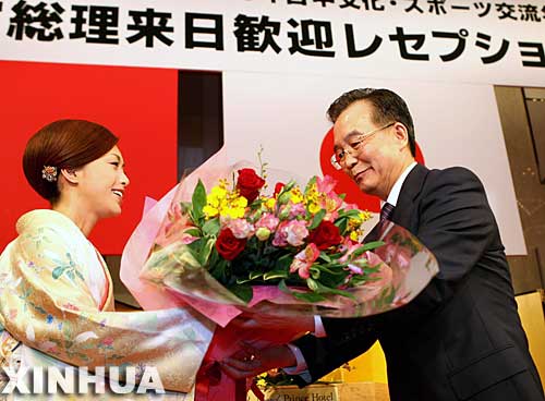 4月12日,中国国务院总理温家宝同日本首相安倍晋三在东京共同出席日中友好七团体联合举行的招待会。这是“2007日中文化体育交流年”日本亲善大使酒井法子向温家宝总理献花。 新华社记者 饶爱民 摄