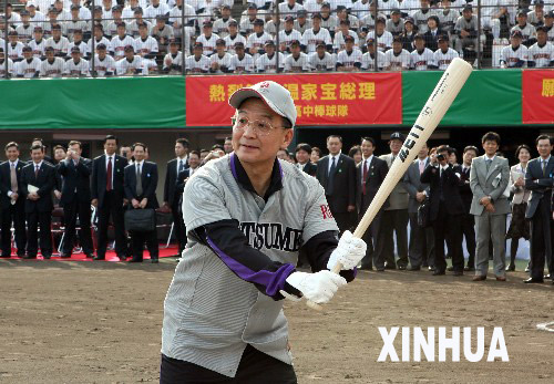 4月13日,正在日本正式访问的中国国务院总理温家宝在京都西新京极棒球场与日本立命馆大学棒球俱乐部队员切磋棒球技艺。 新华社记者饶爱民摄