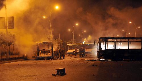 7月6日凌晨,在乌鲁木齐市大湾南路的跑马场地段,多辆公交车被烧毁,消防官兵赶到现场救援。新华社记者 沈桥 摄