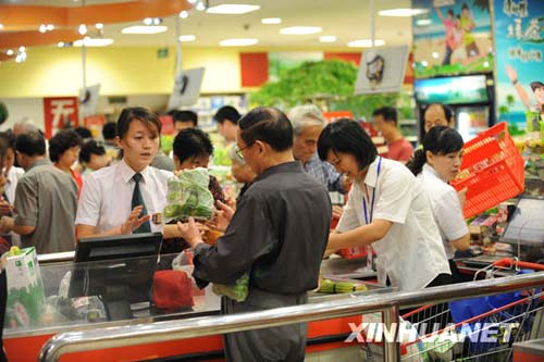7月8日,在乌鲁木齐市王府井百货超市,市民正在收款台结账。“7·5”事件发生后,乌鲁木齐城市生产生活受到一定影响。为确保居民正常生产、生活需要,乌鲁木齐市采取多项举措,全力保证供应。新华社记者沙达提 摄