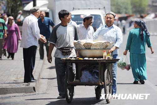 7月9日,在乌鲁木齐市二道桥地区街头,商贩在推车叫卖小吃。新华社记者沙达提摄