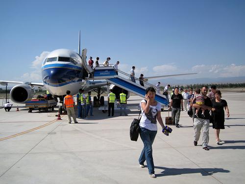 乘坐乌鲁木齐—伊宁航班的乘客走下飞机(7月8日摄)。经过3个多月的紧张建设,新疆伊宁机场改扩建工程顺利完工,7月8日,乌鲁木齐—伊宁航班复航。新华社记者 何俊昌 摄