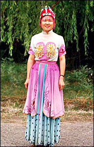 服饰:塔塔尔族男子喜欢穿绣花白衬衣,套黑色背心。女子喜欢穿连衣裙,头戴绣花软帽,多为黑色或深色底,花卉图案十分艳丽。