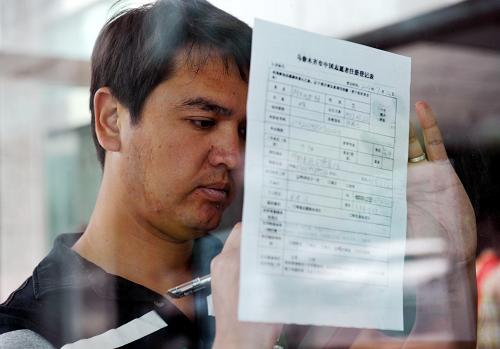 7月12日,在乌鲁木齐市团委的招募大厅,一名维吾尔族青年在填写志愿者申请表。为做好“7·5”事件善后救治、安抚和帮扶工作,自7月10日起新疆志愿者协会秘书处和乌鲁木齐志愿者协会开始招募志愿者,从事心理疏导、专业伤员护理等工作。连日来,各族群众通过现场和电话方式踊跃报名,截至12日中午12点,报名人员已经接近3000人。新华社发(江文耀 摄)