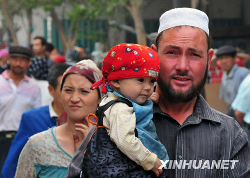 7月12日,在新疆阿克苏市规模最大的托克逊巴扎上,一名男子抱着孩子赶巴扎。