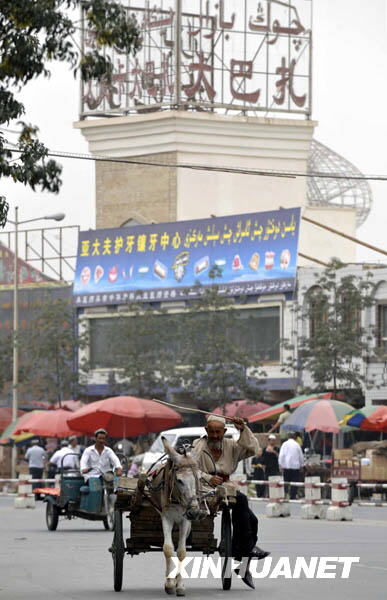 7月12日,一位老人驾着驴车前往新疆和田市艾提卡大巴扎赶巴扎。新华社记者 赵戈摄
