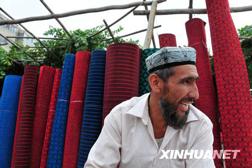 7月12日,阿布拉·买提尼亚孜在新疆阿克苏市规模最大的托克逊巴扎上卖地毯。新华社记者 侯俊摄