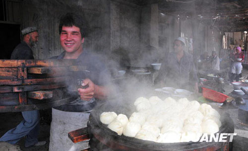 7月12日,一名商贩在新疆阿克苏市规模最大的托克逊巴扎上卖包子。新华社记者 侯俊摄