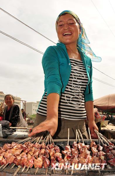 7月12日,在乌鲁木齐山西巷巴扎上,一名商贩在叫卖特色小吃。当日是新疆不少地方的巴扎日,各族群众纷纷走出家门,扶老携幼赶巴扎,选购生产生活用品。巴扎在维吾尔语中意为集市,遍布新疆城乡。因为地处古老的丝绸之路上,新疆人自古就有经商的传统,巴扎就是他们从事商贸活动的场所。新华社记者 陈树根 摄
